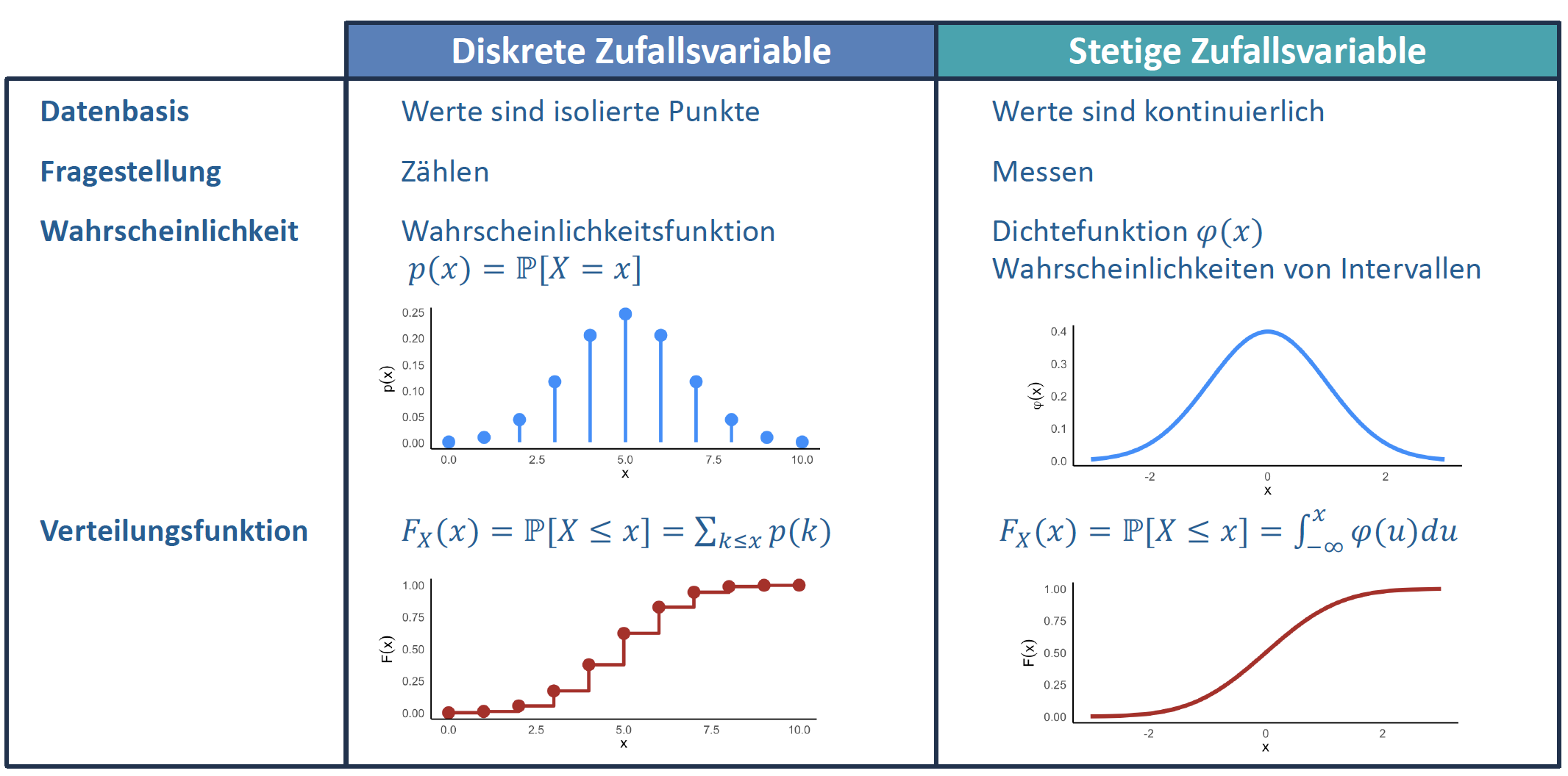 - Stetige (kontinuierliche) Zufallsvariablen: Können jeden beliebigen Wert in einem bestimmten Intervall annehmen (Messwerte).